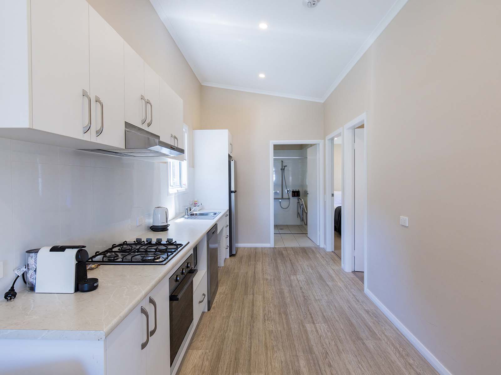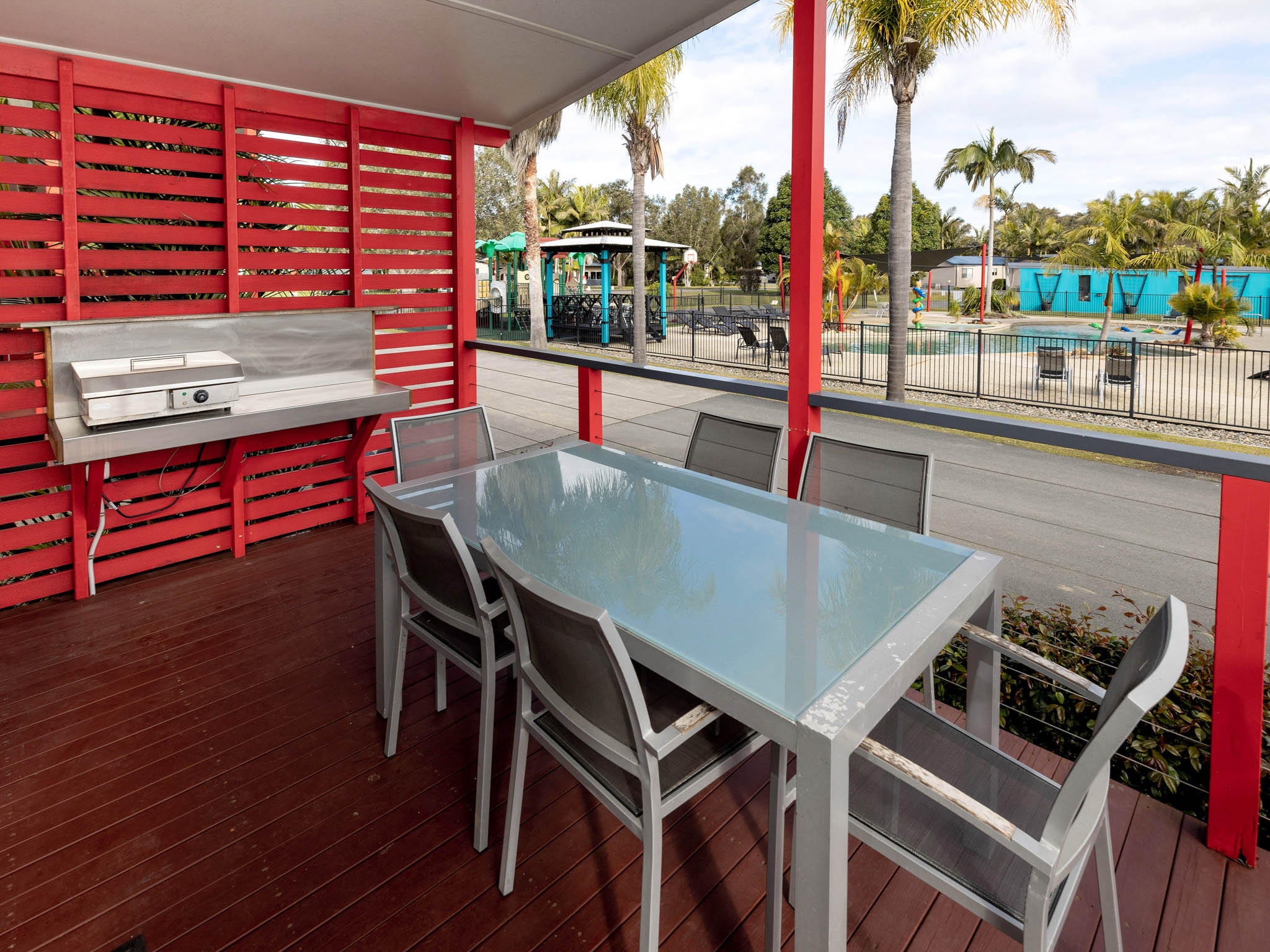The main bedroom features a queen bed, while the second bedroom includes a single bed and a bunk bed—ideal for families or small groups. The well-equipped kitchen offers a stovetop, microwave, dishwasher, and fridge. Step outside to a private deck with a BBQ, perfect for relaxing and taking in the serene poolside atmosphere.